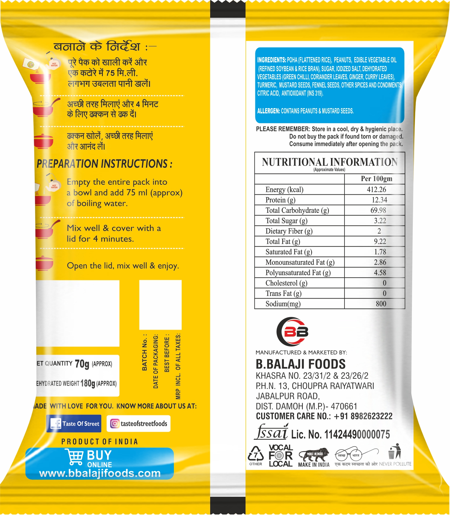 Enjoy the classic taste of Poha with a Jain twist! Prepared without onion and garlic, our Jain Poha is a perfect blend of flattened rice, crunchy peanuts, aromatic spices, and a mix of dehydrated vegetables like ginger, curry leaves, green chilli, etc. It brings you all the bold street food flavour, made with care. Just add hot water, and in 4 minutes, you’ll have a wholesome, satisfying meal—perfect for breakfast, a quick snack, or anytime you’re in the mood for something delicious and quick.